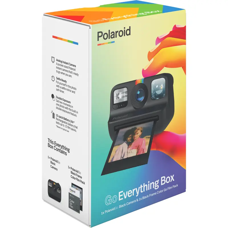 Go Everything box Polaroid jest idealnym zestawem na rozpoczęcie zabawy z aparatem do fotografii natychmiastowej. Aparat natychmiastowy Go ma nowy ulepszony design. Wprowadzone zmiany umożliwiły łatwiejsze korzystanie i trzymanie aparatu w ręce. Aparat Polaroid Go black to najmniejszy aparat do fotografii natychmiastowej, który zabierzesz ze sobą wszędzie. Pomimo małych rozmiarów nie ustępuje większym modelom pod względem funkcjonalności.