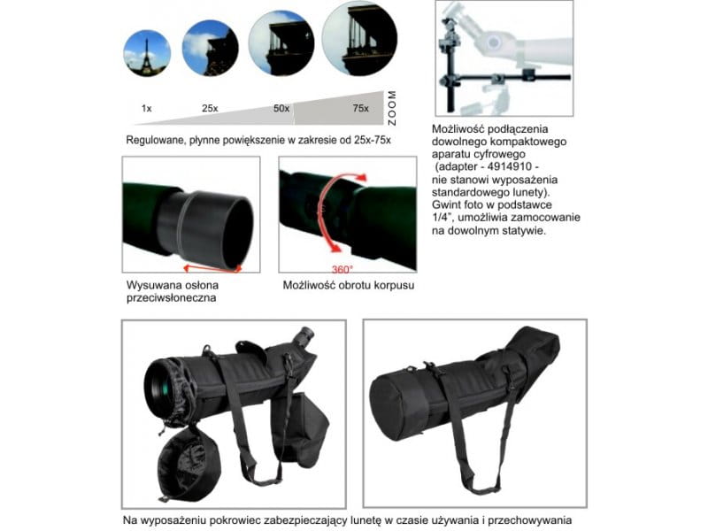- Powiększenie: 25-75x,
