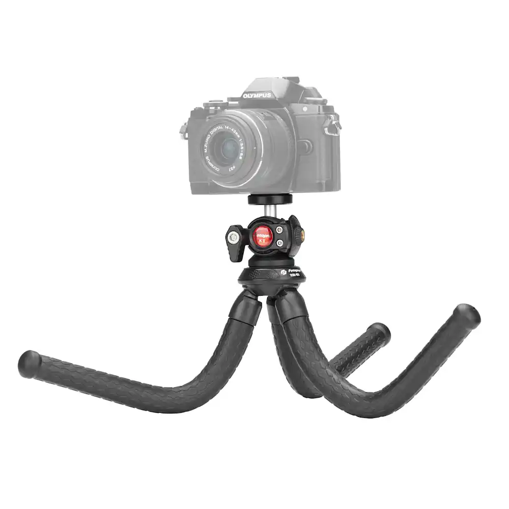 Mini statyw do telefonu Fotopro Alien Pod czarny to uniwersalny statyw tipod o elastycznych nogach. Elastyczne nogi pokryto czarną gumą antypoślizgową. Zakres wysokości roboczych statywu 10-24 cm (bez uchwytu, głowicy kulowej). Mówimy o uniwersalnym statywie tripod ponieważ producent zamieścił w zestawie aż dodatkowe 2 uchyty i głowicę kulową. Głowica kulowa służy do mocowania kamery wideo lub aparatu fotograficznego. Wśród uchwytów znajdziemy natomiast uchwyt do telefonu oraz uchwyt do kamery sportowej. W zależności od potrzeb możemy zamontować odpowiednie akcesorium, a następnie posiadane urządzenie typu aparat, kamera, telefon, lub kamera sportowa. Mini statyw tripod Fotopro Alien Pod czarny pozwala na realizację filmów oraz wykonanie zdjęcia z trudno dostępnych miejsc. Pozwala również na uzyskanie kreatywnych, niestandardowych kadrów. Mini statyw do telefonu Fotopro Alien Pod został bardzo dobrze wykonany i oferuje duże możliwości funkcjonalne. Przy cenie zestawu poniżej 100zł brutto statyw Fotopro Alien Pod to również bardzo dobry stosunek jakości i funkcjonalności do ceny.