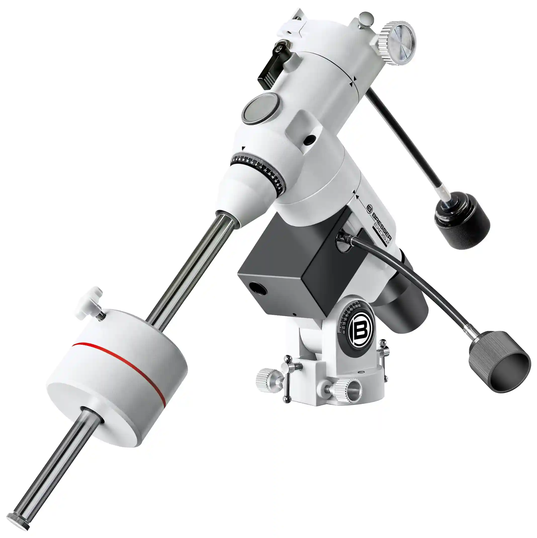 Bresser EXOS 2 to kompletny zestaw montażu do teleskopu wraz z statywem serii Messier. Na dużym, metalowym, statywie o wadze 4.9 kg osadzono montaż paralaktyczny EQ5. Nogi statywu o średnicy 1,.25" zapewniają odpowiednią stabilność. Wysokość robocza statywu jest regulowana do wartości maksymalnej 108 cm. W obu osiach montażu producent zastosował trwałe łożyska kulowe dla zapewnienia precyzyjnych ruchów teleskopu.