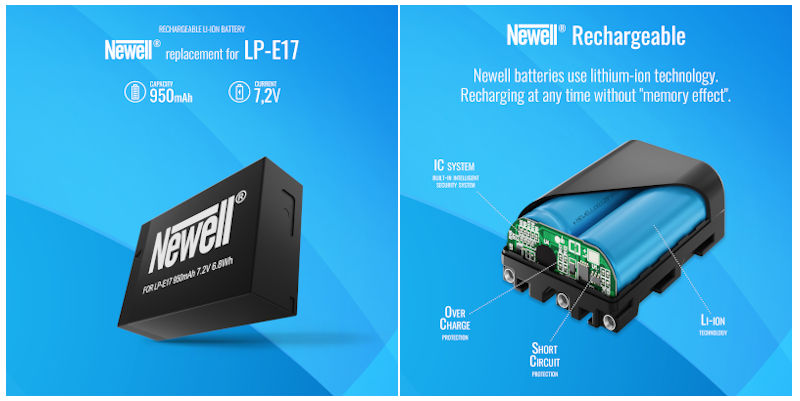 Wbudowany, inteligentny system zabezpieczający, oparty na układzie elektronicznym IC reguluje proces ładowania. Gwarantuje to bezpieczeństwo i ochronę dla urządzenia oraz użytkownika. Dzięki użytym ogniwom litowo jonowym akumulator może być wielokrotnie ładowany i rozładowywany bez efektu pamięci. Akumulator Newell LP-E17 oferuje możliwość współpracy z aparatami EOS RP, 760D, 750D, M3, 77D