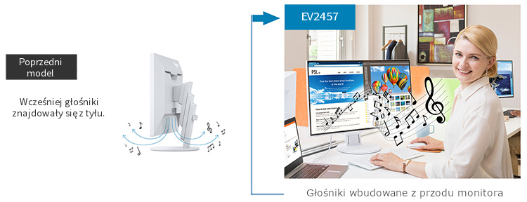 W modelu EV2457 głośniki zostały wbudowane z przodu obudowy, dzięki czemu wydobywające się z nich dźwięki dochodzą prosto do użytkownika, a nie do osób stojących lub siedzących za monitorem.