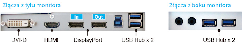 Monitor wyposażono w trzy złącza wejściowe (DisplayPort, HDMI i DVI-D) oraz jedno złącze wyjściowe DisplayPort 1.2 MST do połączeń szeregowych. Oprócz tego do dyspozycji użytkownika są cztery porty USB 3.1 typu A i wejście słuchawkowe.