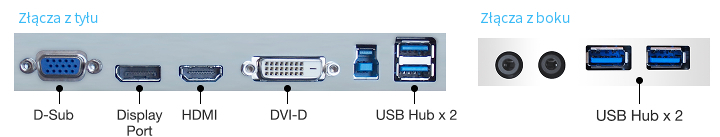Monitor wyposażono w trzy złącza wejściowe: DisplayPort, HDMI i D-Sub. Do podłączania urządzeń peryferyjnych służą dwa porty USB 3.1 typu A oraz wejście słuchawkowe.