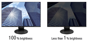 W odróżnieniu od rozwiązań konkurencyjnych, monitory biurowe EIZO pozwalają na bardzo precyzyjna regulację jasności ze skokiem co 1 cd/m². Co więcej, możliwe jest obniżenie jasności do 1% nominalnej wartości – funkcja przydatna w bardzo ciemnych pomieszczeniach.