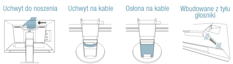 Posiada również mocowanie umożliwiające szybkie odłączenie ekranu od stopki i umieszczenie go na dowolnym ramieniu zgodnym ze standardem VESA oraz prosty uchwyt pomagający zapanować nad plątaniną kabli