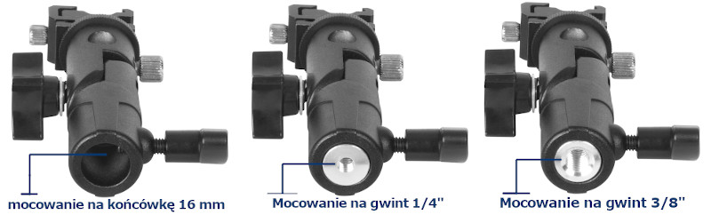 Uchwyt można przymocować do statywów oświetleniowych z końcówką o maksymalnej szerokości 16 mm, a dołączony w komplecie trzpień z gniazdami żeńskimi 1/4" oraz 3/8" rozszerza możliwość montażu uchwytu o statywy fotograficzne, głowice oraz inne wyposażone w trzpień z końcówkami męskimi 1/4" i 3/8"