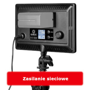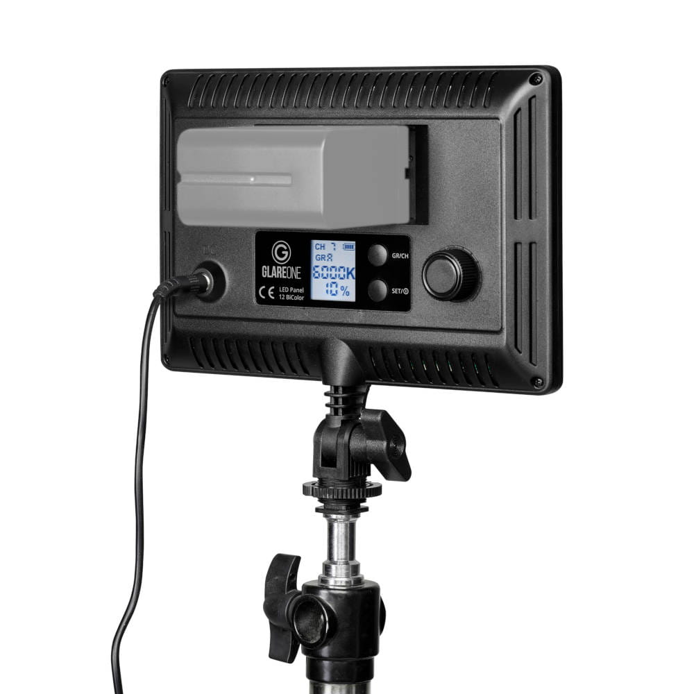Zasilanie lampy odbywa się z dwóch różnych źródeł energii. Z sieci elektrycznej przy pomocy kabla zasilającego (dołączonego w zestawie). Ten rodzaj zasilania znajdzie zastosowanie w studio i pozwoli na długotrwałą pracę bez zakłóceń. W terenie i miejscach gdzie nie ma dostępu do źródeł zasilania można użyć akumulator z serii NP-F ( dostępny jako opcja ). Akumulator mocowany jest bezpośrednio na lampie i nie ma potrzeby stosowania żadnych dodatkowych adapterów lub przewodów. Możliwość zasilania z różnych źródeł energii świadczy o dużej uniwersalności użytkowej GlareOne LED Panel 12.