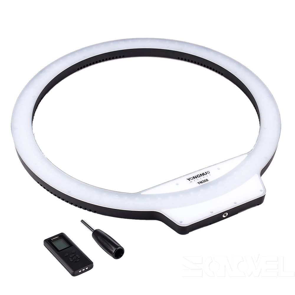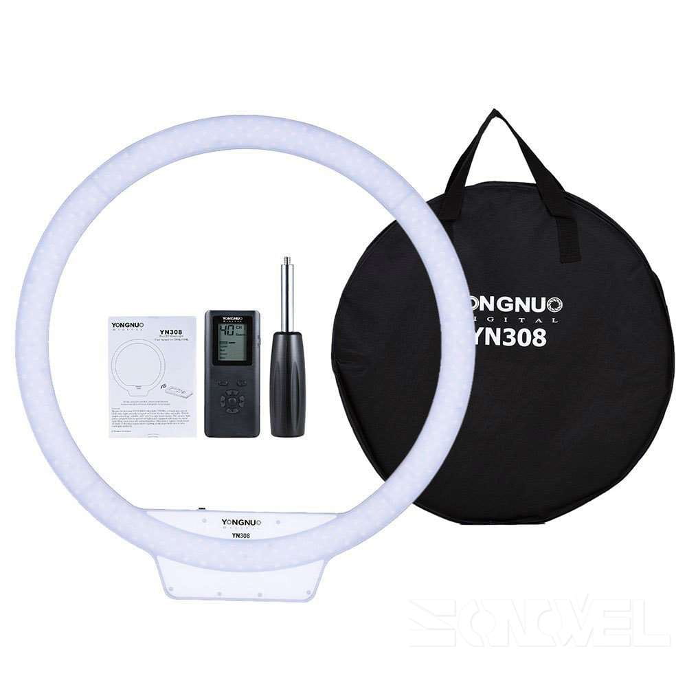 YN308 jest wyposażony w specjalistyczny pilot zdalnego sterowania, który może dostosować wymaganą temperaturę barwową i natężenie światła w zależności od wymaganego efektu świetlnego. Ściemnianie i odwzorowanie kolorów jest dokładne i niezawodne. Pilot wyposażony jest w czytelny wyświetlacz LCD oraz wygodne przyciski, umożliwia grupowanie i zdalną kontrolę nad wieloma lampami jednocześnie, a także sterowanie innymi modelami lamp Yongnuo, w tym: YN360, YN600 RGB oraz YN608 RGB. Zasilanie YN308 może być realizowane poprzez zasilacz zewnętrzny 12 V / 5 A lub dwa akumulatory litowo-jonowe z serii NP-F. Dwa sposoby zasilania sprawiają, że lampa jest idealnym urządzeniem do pracy zarówno w studio, jak i w plenerze. Lekka konstrukcja i mocowanie statywowe żeńskie 1/4” umożliwiają pracę „z ręki” oraz montaż na statywie.