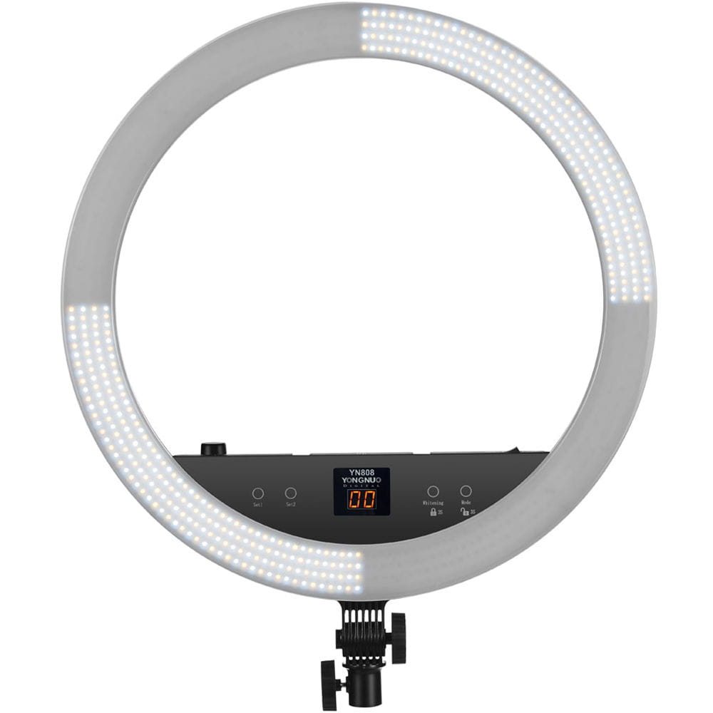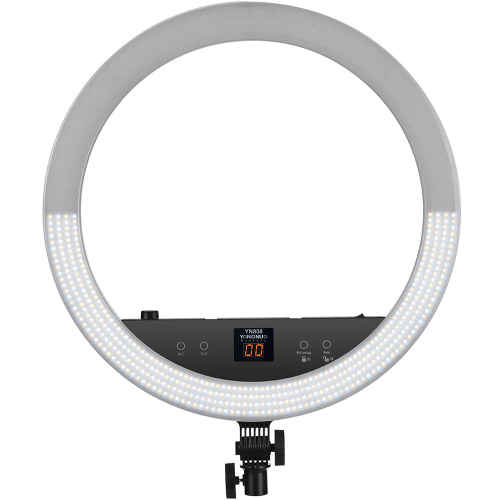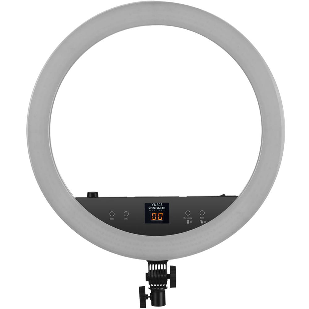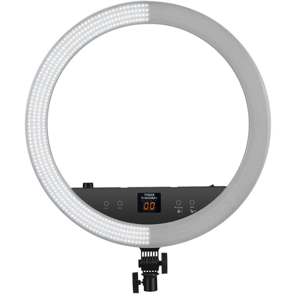 Yongnuo YN808 to pierścieniowa lampa LED przeznaczona dla fotografów portretowych i nagrywających video. Dwa rodzaje diod pozwalają na regulację temperatury barwowej światła w przedziale 3200 K - 5500 K. Panel lampy składa się z diod LED o wysokim współczynniku reprodukcji barw. Współczynnik CRI na poziomie 95+ zapewnia wierne odwzorowanie kolorów, np. skóry, makijażu. Okrągły kształt lampy zapewnia charakterystyczne odbicia w oczach. Lampa YN808 zaprojektowana została z myślą o fotografii portretowej, studyjnej oraz makro. Duży rozmiar ponad 50 cm średnicy pozwala na oświetlenie większych powierzchni. Lampę YN808 można przechylić w kilku pozycjach. Kompatybilność z niemal każdym statywem oświetleniowym zapewnia standardowe mocowanie oświetleniowe na trzpień 16 mm.
