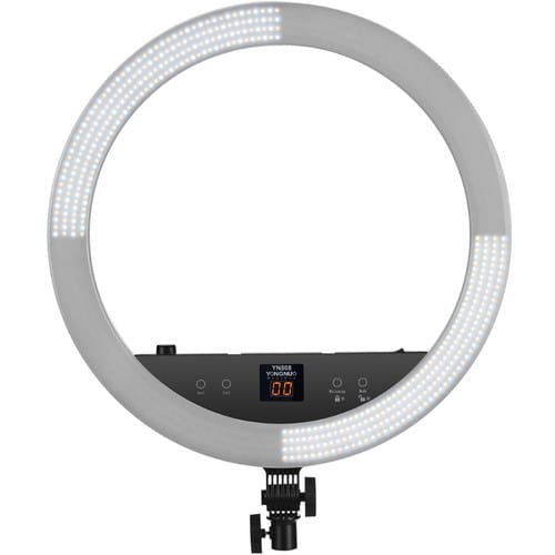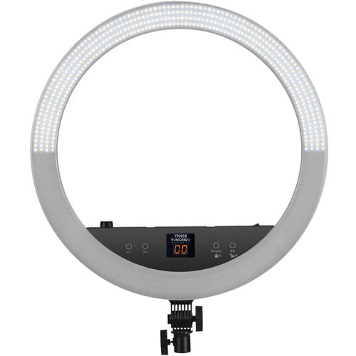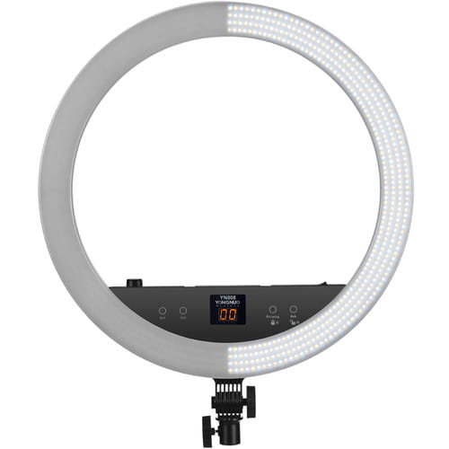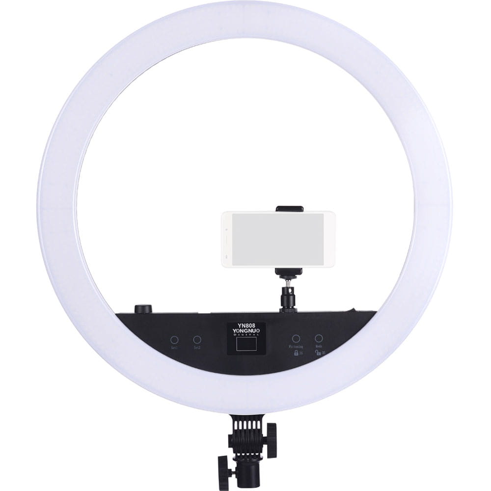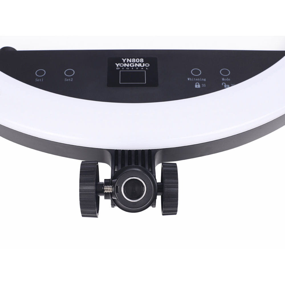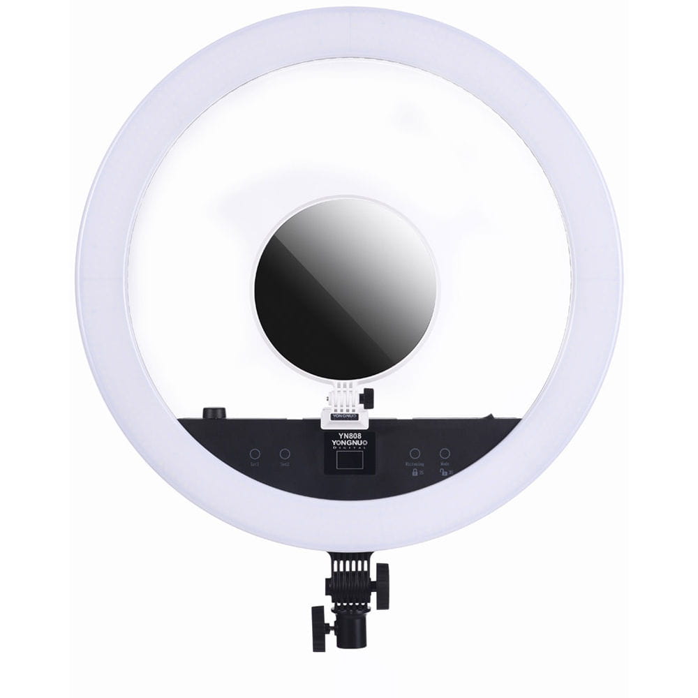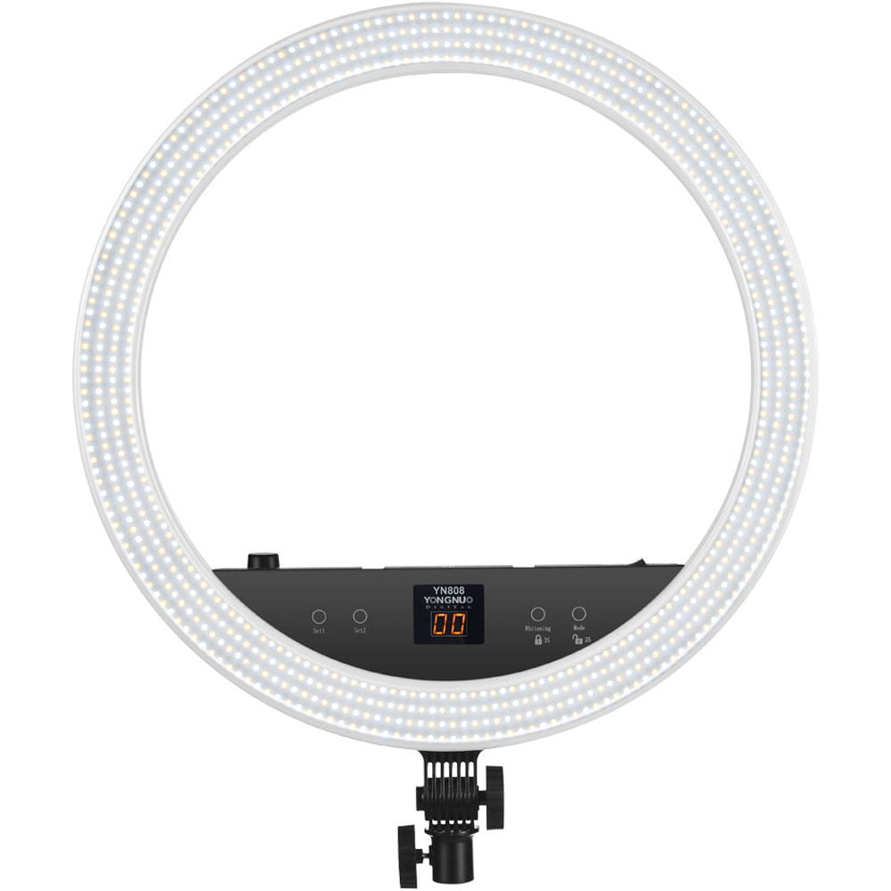 Yongnuo YN808 to pierścieniowa lampa LED przeznaczona dla fotografów portretowych i nagrywających video. Dwa rodzaje diod pozwalają na regulację temperatury barwowej światła w przedziale 3200 K - 5500 K. Panel lampy składa się z diod LED o wysokim współczynniku reprodukcji barw. Współczynnik CRI na poziomie 95+ zapewnia wierne odwzorowanie kolorów, np. skóry, makijażu. Okrągły kształt lampy zapewnia charakterystyczne odbicia w oczach. Lampa YN808 zaprojektowana została z myślą o fotografii portretowej, studyjnej oraz makro. Duży rozmiar ponad 50 cm średnicy pozwala na oświetlenie większych powierzchni. Lampę YN808 można przechylić w kilku pozycjach. Kompatybilność z niemal każdym statywem oświetleniowym zapewnia standardowe mocowanie oświetleniowe na trzpień 16 mm.
