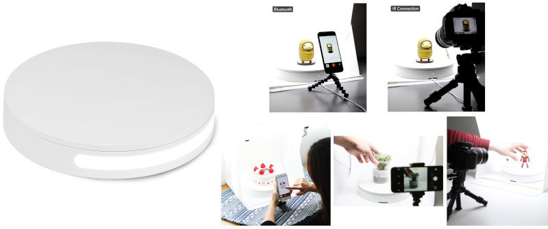 Automatyczny system fotografowania wykorzystuje czujniki Bluetooth i IR do bezpośredniego połączenia ze smartfonem lub kamerą. Kliknięcie przycisku w aplikacji Foldio360 podstawy uruchamia proces, który wykonuje zdjęcia ze wszystkich stron obiektu i łączy je w jeden 360-stopniowy obraz do udostępniania w Internecie lub e-commerce.