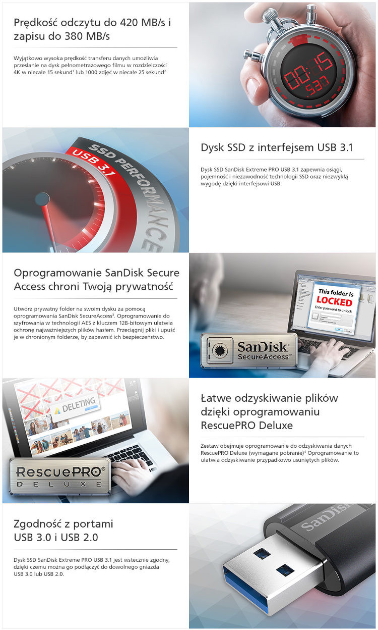 Pendrive SanDisk Extreme PRO USB 3.1 zapewnia wyjątkową szybkość w kompaktowej obudowie z interfejsem USB 3.11. To prawdziwy przełom w kategorii pamięci masowych z interfejsem USB: urządzenie zapewnia prędkości odczytu do 420 MB/s oraz prędkości zapisu do 380 MB/s1, dzięki czemu prześlesz wszystkie pliki naprawdę szybko. Dzięki pojemności 256GB masz wystarczającą ilość miejsca na przechowywanie nawet bardzo dużych plików. Starannie wykonana aluminiowa obudowa jest zarówno elegancka, jak i trwała, a dołączone do zestawu oprogramowanie SanDisk SecureAccess™ z ochroną hasłem i szyfrowaniem 128-bitowym gwarantuje prywatność Twoich plików4. Pamięć masowa SanDisk Extreme PRO USB 3.1 objęty jest też 30-letnią gwarancją6, dzięki której możesz spać spokojnie.