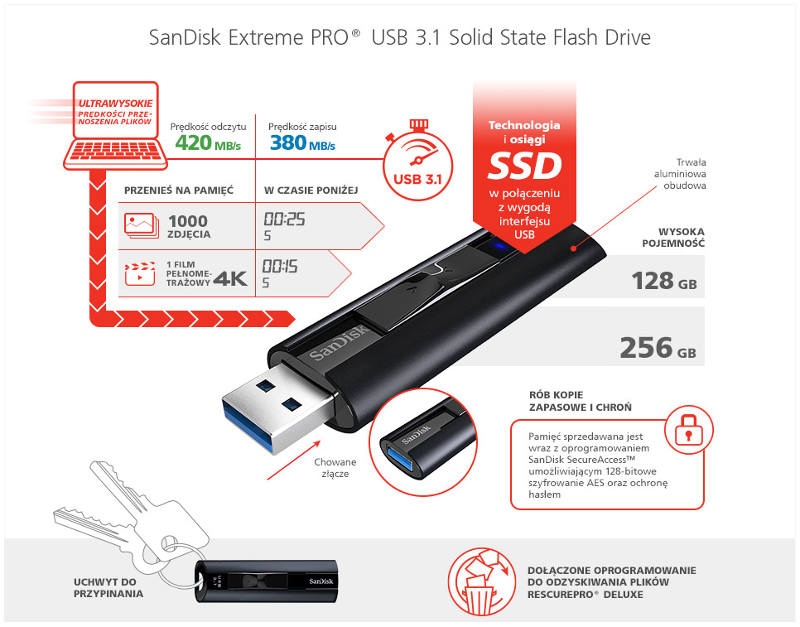 Pendrive Sandisk Extreme Pro USB 3.1 Flash Drive 256GB 420/380 MB/s - jeden z najszybszych pendrivów na rynku!