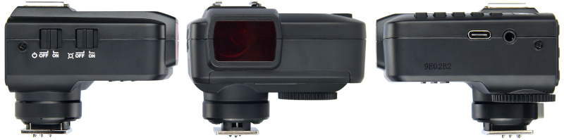 Z przodu obudowy umieszczona jest dioda, której podstawowym zadaniem jest wspomaganie automatycznych systemów ustawiania ostrości, w których wyposażone są aparaty***** . Przyda się to szczególnie w sytuacjach, gdy sesja odbywa się w warunkach słabego oświetlenia zarówno w studiu jak i poza nim. Podłączenie nadajnika do aparatu zostało udoskonalone i opiera się na stopce wyposażonej w mechanizm blokady, który pozwala na szybkie podpięcie i odpięcie urządzenia. Na bocznym panelu obudowy znajduje się złącze USB typu C, które służy do aktualizacji oprogramowania wewnętrznego oraz port synchronizacji przewodowej, który może zarówno przyjmować jak i wyprowadzać sygnał na zewnątrz. Nadajnik zasilany jest za pomocą dwóch baterii typu AA.
