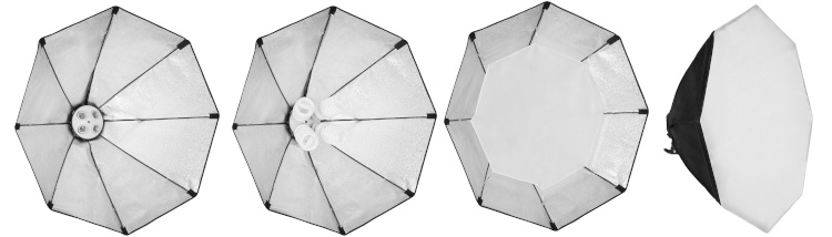 Niezawodny softbox typu octa, to taki który regularnie oświetli fotografowany obiekt, zmiękczy światło, wyeliminuje cienie na zdjęciach, a w przypadku fotografii portretowej pozwoli uzyskać ładny blik / odbicie światła w oczach modela. Wszystko to uzyskasz przy pomocy octy 85 cm zintegrowanej z oprawą na cztery świetlówki z mocowaniem E27.