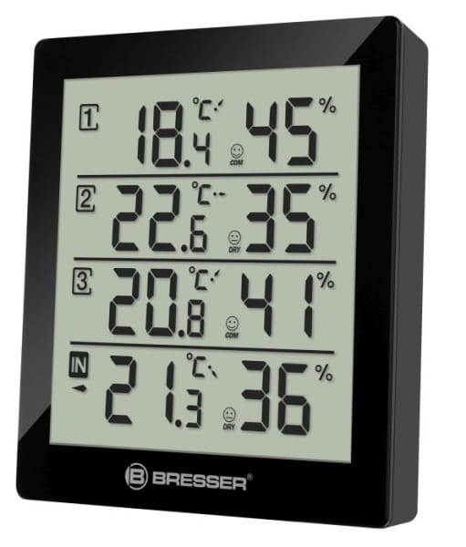 Bresser stacja pogodowa Temeo Hygro Quadro to bezprzewodowa stacja pogodowa pozwalająca na pomiar temperatury i wilgotności powietrza w 4 miejscach jednocześnie. Pomiar odbywa się przy pomocy samej stacji oraz 3 bezprzewodowych czujników. Transmisja danych odbywa się przy pomocy sygnału radiowego o częstotliwości 433 MHz na odległość do 30m. Zasięg uzależniony jest do rodzaju ośrodków przez które przenikają fale radiowe, gdzie następuje tłumienie sygnału. Urządzenie umożliwia definiowanie alarmów dla zadanych wartości temperatury oraz wilgotności. Informuje również o trendzie dla temperatury, czy komforcie w jakim się znajduje użytkownik, zależnie od wskazań temperatury i wilgotności powietrza.