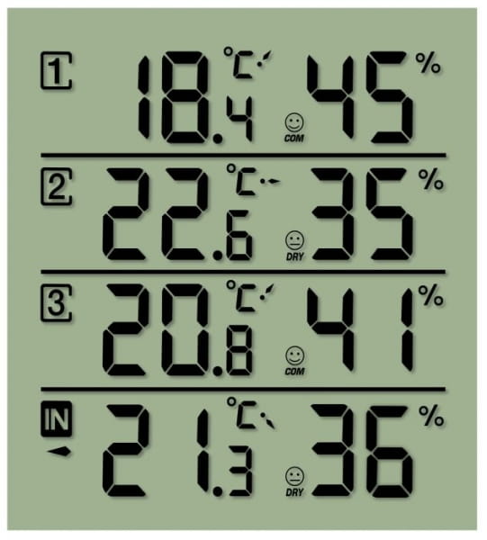 - Trzy poziomy komfortu dla wilgotności oznaczone ikonami (<45%, 40-70%, >70%),