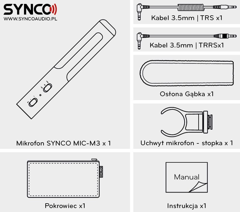W zestawie do SYNCO M3 otrzymasz niezbędne akcesoria dla zapewnienia właściwej pracy i ochrony mikrofonu. W komplecie znajduje się bawełniana osłona przeciwwiatrowa minimalizująca szum wiatru, amortyzator wykonany z poliamidu, który redukuje wstrząsy, płócienna torebka chroniąca mikrofon przed zarysowaniem oraz kable TRS / TRRS 3,5 mm umożliwiające podłączenie mikrofonu do różnego rodzaju urządzeń.