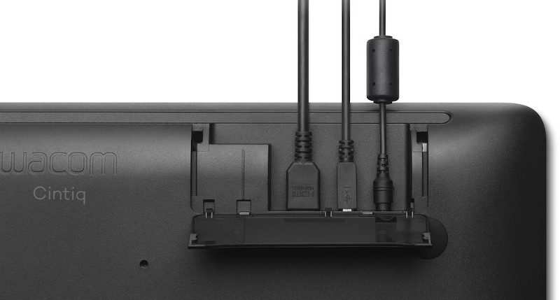 W zestawie z tabletem Cintiq 22 znajdują się kabel HDMI, kabel USB oraz kabel zasilający. Złącza wejściowe usytuowane są u góry ekranu, co pozwala uniknąć bałaganu na biurku. Ponadto uchwyt na piórko z zapasowymi końcówkami można umieścić z prawej lub lewej strony tabletu, wedle upodobania.