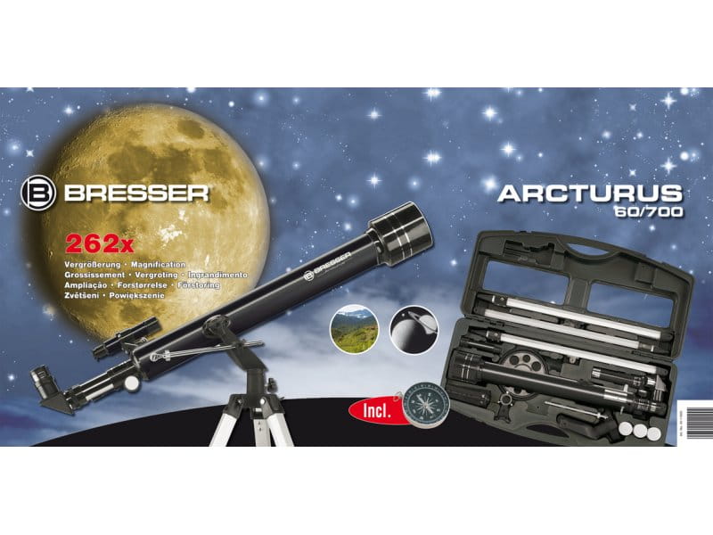 Klasyczny teleskop soczewkowy w układzie refraktora achromatycznego przeznaczony dla początkujących użytkowników. Bresser Arcturus posiada tubus optyczny o aperturze 60 mm i ogniskowej 700 mm. Soczewki teleskopu dla początkujących zostały wielokrotnie pokryte warstwami anty-refleksyjnymi (MC - Multi Coated) dla poprawy transmisji światła. Teleskop refraktorowy o aperturze 60 mm jest w stanie zebrać ponad 73x więcej światła od nieuzbrojonego oka ludzkiego. Producent zadbał o bardzo bogate wyposażenie teleskopu w skład którego wchodzą podstawowe, ale za to aż 3 okulary o ogniskowych 20 mm, 12.5 mm (Huygensa), 4 mm (Ramsdena). Soczewka odwracająca 1.5x umożliwia komfortowe prowadzenie obserwacji naziemnych (obraz nie będzie odwrócony). Dołączony do zestawu kompas oraz obrotowa mapa nieba ułatwiają prawidłowe ustawienie teleskopu względem zadanych obiektów nocnego nieba.