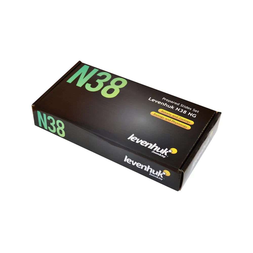 Levenhuk N38 jest zestawem preparatów wielokrotnego użytku na płytkach szklanych. Zestaw zawiera preparaty pod mikroskop z takich dziedzin jak: Botanika, Zoologia, Biologia. Zestaw Levenhuk N38 NG zawiera 38 szt preparatów. Dodatkowo w pudełku znajdują się szkiełka podstawowe i nakrywkowe. Szkiełka wykonane zostały z dobrej jakości szkła o wysokiej przezroczystości. Dzięki temu przygotowane na nich preparaty pozwolą uzyskać obrazy wolne od zniekształceń i odblasków.