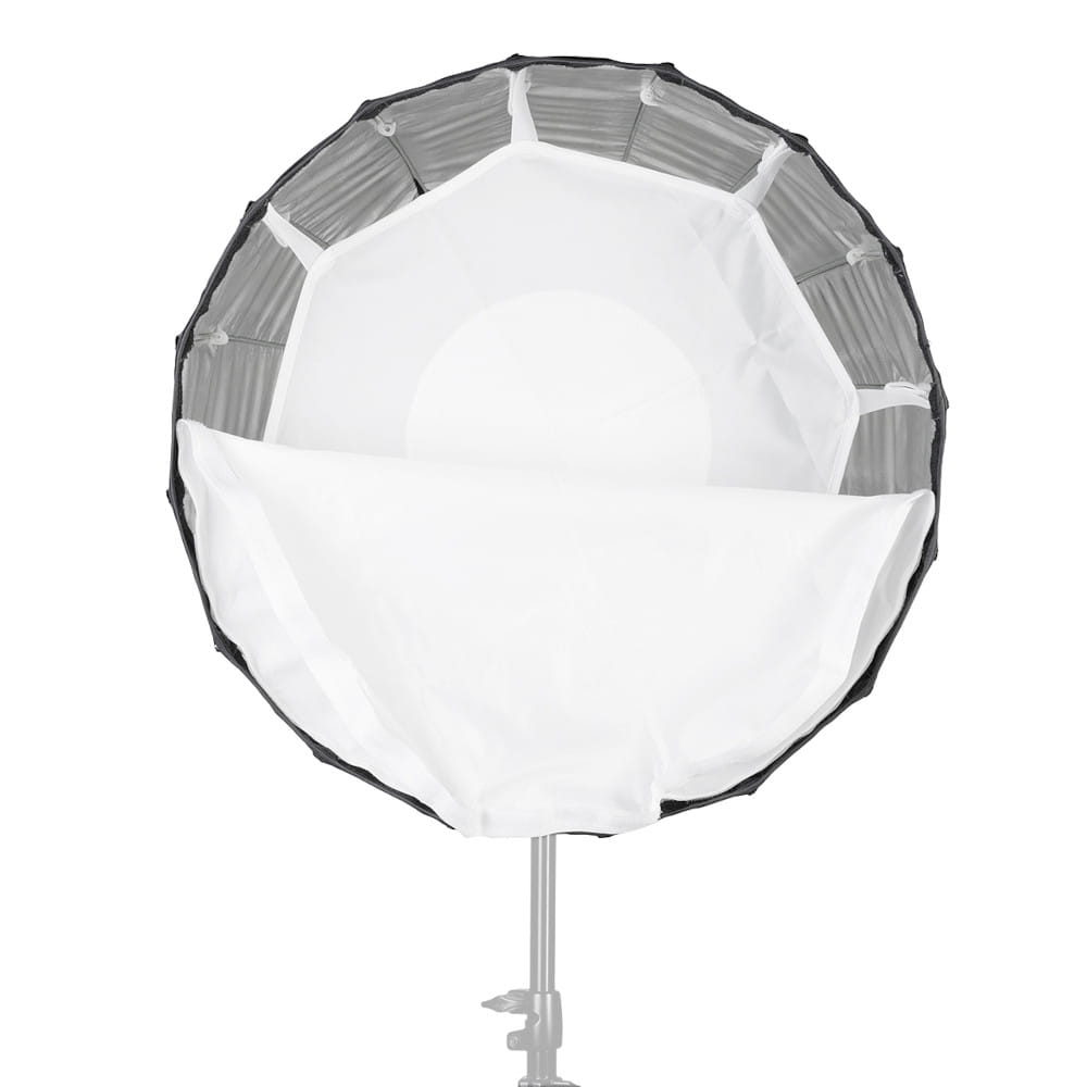 Softbox heksagonalny Quadralite jest wyposażony w dwa dyfuzory z poliestru ripstop. To umożliwia uzyskanie bardzo miękkiego światła. Mamy wrażenie otulania fotografowanej osoby światłem. Dyfuzory Quadralite mają minimalny wpływ na balans bieli światła lampy. Dyfuzor wewnętrzny w swojej centralnej części ma naszyty dodatkowy, trzeci dyfuzor. Jego zadanie to bardziej zmiękczyć światło biegnące bezpośrednio od lampy.