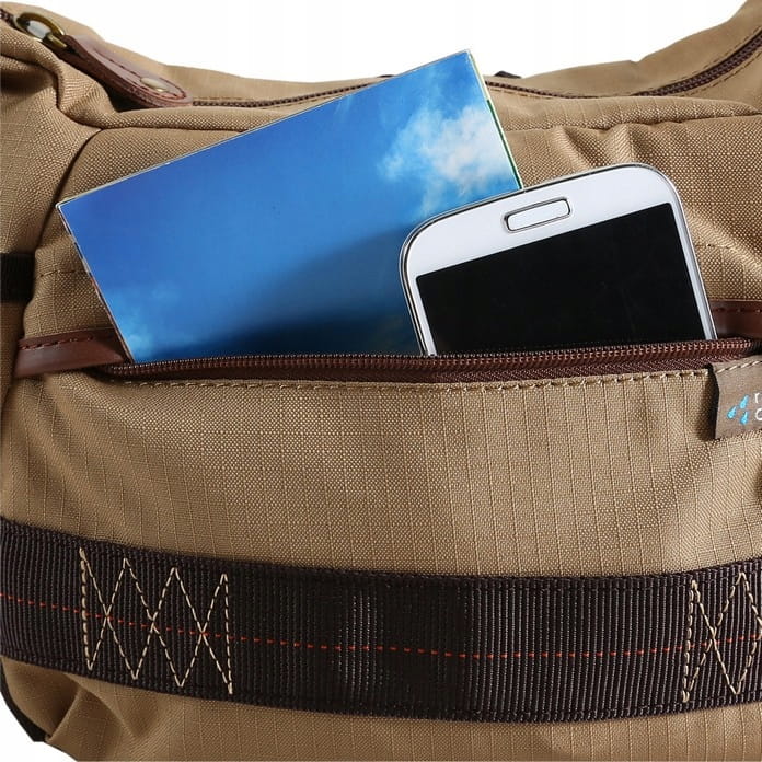 Torba fotograficzna Havana 21 z przodu na zewnątrz ma kieszeń idealną na smartfon, portfel i inne drobiazgi. W kieszeni jest smycz na klucze, złożony pokrowiec przeciwdeszczowy i wszyte przeźroczyste etui z dwoma przegródkami na karty pamięci.